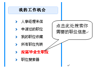 注意:如果你是應(yīng)屆畢業(yè)生可以進(jìn)入"個(gè)人管理中心",位于左側(cè)子欄目的"我的工作機(jī)會",點(diǎn)擊"應(yīng)屆畢業(yè)生職位"如下圖所示: