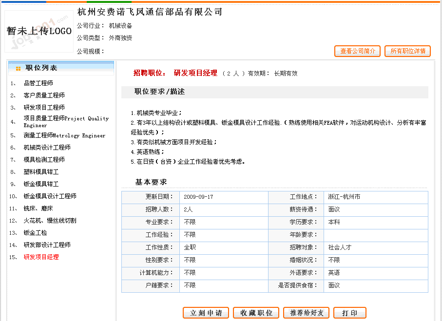2) 點(diǎn)擊任意一個(gè)職位,然后點(diǎn)擊"立刻申請"